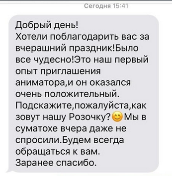 Спасибо за отличную работу и профессионализм. Главная задача, это занять детей во время праздника. Вы с ней справились великолепно.